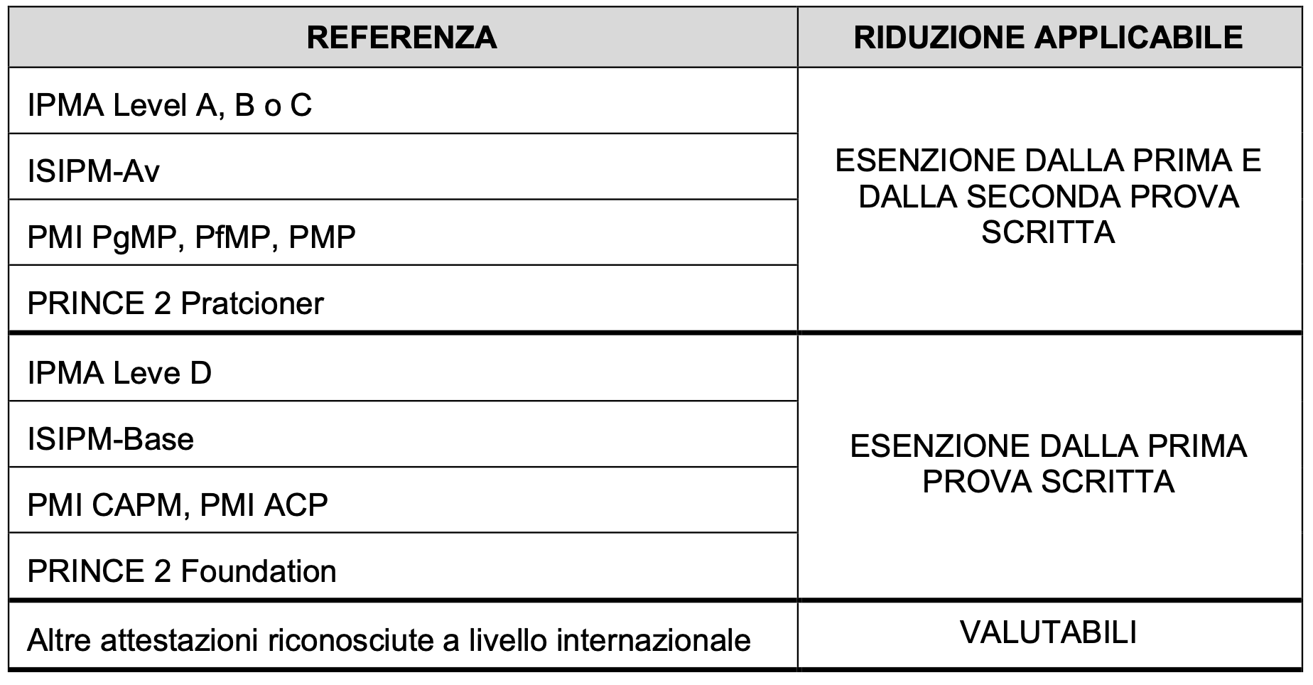 ICMQ intende riconoscere le capacità ed abilità dei professionisti che documentino competenze di eccellenza tramite attestazioni o con elementi oggettivi qualificanti deducibili dal curriculum del candidato che documentino in modo incontrovertibile il grado di competenza, permettendo lo svolgimento dell’esame di certificazione in forma semplificata con l’esonero di una o entrambe le prove scritte, ICMQ può applicare tali riduzioni all’iter d’esame qualora il candidato, in fase di istruttoria, presenti evidenza di attestazioni e qualificazioni riconosciute quali standard a livello nazionale e/o internazionale i cui contenuti risultino allineati a quelli delle norme UNI ISO 21500:2021 e UNI ISO 21502:2021 (gli attestati non possono quindi essere precedenti al 2021). Nella tabella seguente vengono indicate le principali referenze riconosciute da ICMQ e la relativa riduzione applicabile: